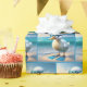 A fluffy white duck stands on the sandy shore, ready for a swim with blue flippers on its feet and goggles.