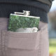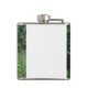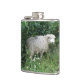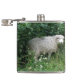 This awesome flask features a photograph of a cute fluffy sheep. The sheep is surrounded by wild flowers and long grass and is eating some leaves. It has a thick white coat of wool and a cute black nose.
