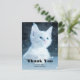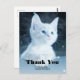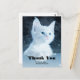Thank you postcard with an adorable photograph of a white short-haired kitten with bright blue eyes. Staring off into the distance. Paws crossed in typical kitty cat fashion.
