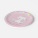 A paper plate with a cute white kitty cat that has a pink bow tied on her tail and a collar that has a paw print icon. Besides the kitten is a little cake with a candle and fish decoration on top. hanging from the top are colourful bunting flags for a touch of party atmosphere. Pastel colour palette of pink, blue, yellow and white. Add your birthday message to make it perfect for a cat themed birthday party.