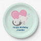 Birthday paper plates with an adorable graphic illustration. A white kitty cat with a cute paw print image on her fur. Sleeping peacefully. A big pink heart behind her and some little stars too. Mint green background.