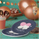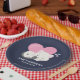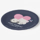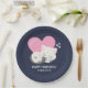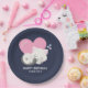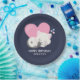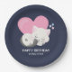 Birthday paper plates with an adorable graphic illustration. A white kitty cat with a cute paw print image on her fur. Sleeping peacefully. A big pink heart behind her and some little stars too. Dark blue background.