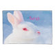 On front: Animal print. Face and head close-up of a cute rabbit with red eyes and white fur. Blue backdrop colour (the rabbit is out in snow) Personalise, and add the kid`s name. Pink coloured letters. Back: no colour, you may add a background colour if you want to.
