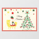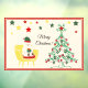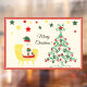 Christmas window cling featuring Christmas greetings "Merry Christmas" with a cute teddy bear sitting on a chair and dressed in a Christmas hat and clutching a gift box next a Christmas tree decorated with Christmas ornaments and colourful stars.