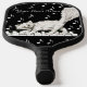 This pickle ball paddle is black with white music notes and a cute white cat walking across piano keys. Customise your text on front and back with the template.