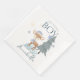 These cute custom boy baby shower napkins feature a watercolor style winter woodland illustration. An image of a male fawn, or baby deer, is printed in the centre, next to a pine tree and falling blue snow.