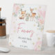 Cute watercolor pink gold winter wonderland woodland baby girl shower favours sign with forest animals: fox, bunny and deer.