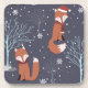 Adorable foxes dressed in red caps and scarves frolic in a snowy forest against a charcoal background.