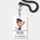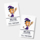 Name badge with a cute witch wearing a big purple witches hat. Her black cat resting on top her head. She has long orange hair and is carrying a broom. Cute cartoon illustration perfect for halloween.