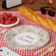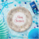 Paper plates with a cute Nordic style pattern. Winter pine trees, bears, reindeer and squirrels. Light brown colour. A white circle layered over top with Merry Christmas written inside.