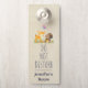 Door hanger personalised with a name with a cute illustration featuring a baby deer and a little squirrel holding an acorn and a butterfly flying above their heads. These adorable woodland creatures on standing on some grass with some whimsical mushrooms by their feet. Sandy brown background. Text says: Do Not Disturb with a personalised name.