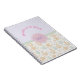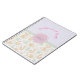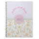 Spiral notebook with the bottom half decorated in a fun pattern illustrated with adorable foxes, cute little birds and whimsical green trees. The top half has a lavender purple background with a linen style texture. The centre has a pastel green banner with a pink circle over top which holds the recipient's name.