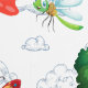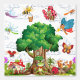 At the center of the scene stands a large friendly tree with a cozy treehouse door, where a happy frog welcomes visitors. Around the tree, delightful characters fill the sky and garden: smiling butterflies, busy bees, dragonflies, ladybugs, squirrels, ants, and other charming woodland friends. Soft clouds and bright colors create a cheerful storybook environment that sparks curiosity and imagination.