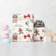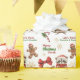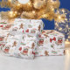 The repeated pattern on this Christmas wrapping paper includes an image of a cute woodland raccoon wearing a winter sweater and a hat. Also included in the pattern is a gingerbread man, a red bow, a candy cane with holly, and varied sizes of ornate gold snowflakes. Stylized red and green text says MERRY CHRISTMAS" with a text field for your child's name. Another text field is for your custom signature.