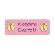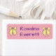 Prepare for back-to-school with these pink and yellow kids' labels, perfect for marking your children's belongings. The labels are organised into two columns: one featuring yellow labels adorned with a pink bow beside the text displaying the girl's name, and the other column showcasing pink labels with a yellow bow. The text is elegantly styled in royal purple and can be easily customised or removed according to your needs.