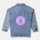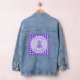 This awesome denim jacket features a graphic image of a cute purple baby bee with black legs and beady eyes. He has a lavender coloured fuzzy body with purple stripes and cute purple antennae on his fuzzy head. His delicate little wings have a pale blue mottled pattern on them.