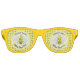 This awesome pair of party shades features a graphic image of a cute yellow baby bee with black legs and beady eyes. He has a yellow fuzzy body with black stripes and cute black antennae on his fuzzy head. His delicate little wings have a pale blue mottled pattern on them.