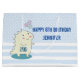 Set on a light blue and white pattern of polka dots and stripes. Personalise with your own text.