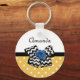 Add a girly vibe to your personal style with this cute yellow and white polka dot pattern basic keychain with a trendy black and white chevron bow and a chic blue ribbon rose. Make this yellow and blue retro meets modern design personalised by adding the name of your teen girl. Flat printed image, NOT actual rosette ribbon and bow.