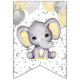 This adorable baby shower bunting flag features yellow and grey baby elephant with balloons, silver stars and moons. Text "Welcome Peanut" fills the flags. Easily customised for your event by clicking personalise. Perfect for a gender neutral baby shower.