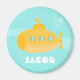 Decorate your fridge with this adorable magnet that comes with a cartoon of a yellow submarine with blue window panes and bubbles coming out from the side. Background of blue wave lines to illustrate that the underwater craft is submerged underwater. Attractive, cheerful and cute for kids who love the ocean, sea and ocean vessels. Personalise easily with child's name. Magnet is fun for attaching the kid's schedule and art pieces to the fridge.