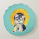 Cute Yorkie Puppy Dog & Sunflower on Teal Round Cushion