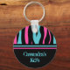 A pretty key chain in a zebra stripes pattern in black, turquoise, and hot pink. Add your name to it.