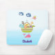A personalised mousepad designed with a cute nursery style illustration with an ark filled with wild animals and a butterfly flying overhead and a friendly whale spouting water below. Some blue clouds float on by. Set on a light blue ombre background.