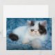 This cute Getty Images photo features a fluffy black and white kitten sitting on blue blanket.