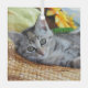 This cute Getty baby animals image features a kitten lying on a mat looking at the camera with sunflowers.
