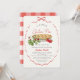 This cute "little cutie pie" girl's baby shower invitation features a strawberry pie with strawberries surrounded by a red bow frame. The reverse side features a white background with red gingham patterns. Personalize it for your needs. You can find matching products at my store.
