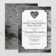 Cutout Heart Birch Tree Bark Wedding Invitations - features a white text box over a birch tree bark background. The back features the same birch bark background. The texts feature a mixture or elegant script and standard fonts in black and grey colours.