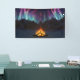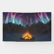In a snow-covered valley on a frosty night in the dead of winter a bonfire leaps up to mirror the northern lights filling the sky above the distant mountains.