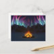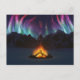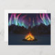 In a snow-covered valley on a frosty night in the dead of winter a bonfire leaps up to mirror the northern lights filling the sky above the distant mountains.