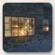 Looking in the cottage windows on a frosty winter night just before Christmas. Bright red candles are alight, sending a warm glow out over the snow. The Christmas tree and mantle are decorated with crimson and gold balls. A calico cats looks out the window at a chickadee sitting outside on the sill, and a pair of foxes peep around the corner of the little house.