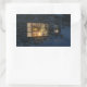 Looking in the cottage windows on a frosty winter night just before Christmas. Bright red candles are alight, sending a warm glow out over the snow. The Christmas tree and mantle are decorated with crimson and gold balls. A calico cats looks out the window at a chickadee sitting outside on the sill, and a pair of foxes peep around the corner of the little house.