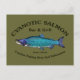 A blue-toned Sockeye Salmon with text reading "Cyanotic Salmon Bar & Grill Kenai, Alaska" and "Combat Fishing Rest And Relaxation. Fishing for salmon is very popular, too popular in Alaska. Imagine hundred of anglers, just about shoulder to shoulder, lining both banks of a stream trying to avoiding crossing lines with everyone else in hopes of landing a big salmon. That's combat fishing. After a day of that take some R&R at the mythical Cyanotic Salmon in Kenai. Fishing tales told there...some true.
