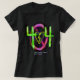 Cyberpunk look t-shirt with glitchy cyber graffiti graphic 404 Error in hot pink and lime green to evoke the neon city lights of a seedy post-apocalyptic cyberpunk underworld. Broken heart as the zero in the centre of a no symbol. Glitchy, static-y graphic art looks like futuristic street art painted with pixels.