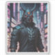 This intense image portrays a menacing demon samurai, adorned with a futuristic, dark outfit and a mask with glowing red eyes and horns. Set in a neon-lit, urban environment inspired by cyberpunk aesthetics, the character stands amidst numerous illuminated signs and symbols, suggesting a bustling, high-tech cityscape.