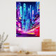 AI generated image of a cyberpunk city with futuristic tall buildings and blue/pink neon lights. It's a digital concept Art with sharp details and bright colours.