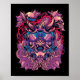 A futuristic, cyberpunk-inspired illustration depicting an oni mask with glowing, neon eyes and a futuristic visor. The mask is surrounded by a coiled snake, skulls, roses, and chains.