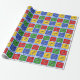 This wrapping paper is ready for personalisation with your custom text and name (in blue). The design has a tiled pattern of four colourful icons (red, yellow, green and blue) with the silhouette of a cyclist.