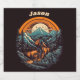 Cycling Life, retro painting in orange and blue of a cyclist riding through the mountains and forest with the sun in the background
