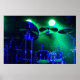 Spotlit cymbals on a foggy stage with a green wash.