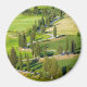 Round souvenir photo magnet with a zigzag winding, cypress tree lined road through the green fields in Monticchiello, Tuscany in Italy.