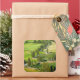 Souvenir photo sticker of a zigzag winding, cypress tree lined road through the green fields in Monticchiello, Tuscany in Italy.