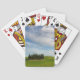 Playing cards with a group of cypress trees in a landscape with green hills and yellow flowers under beautiful white clouds near Torrenieri in the Val d'Orcia (Orcia valley) in Tuscany, Italy.
