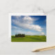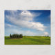 Postcard of a group of cypress trees in a landscape with green hills and yellow flowers under beautiful white clouds near Torrenieri in the Val d'Orcia (Orcia valley) in Tuscany, Italy.