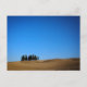 A postcard showing a bunch of cypress trees in a small forest between the rolling barren hills of the Val d'Orcia, Tuscany, Italy.