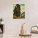 Cypresses by Vincent van Gogh is a vintage fine art post impressionism landscape nature painting. Cypress trees in a meadow, white fluffy clouds in the blue summer sky and a sliver of a crescent moon.